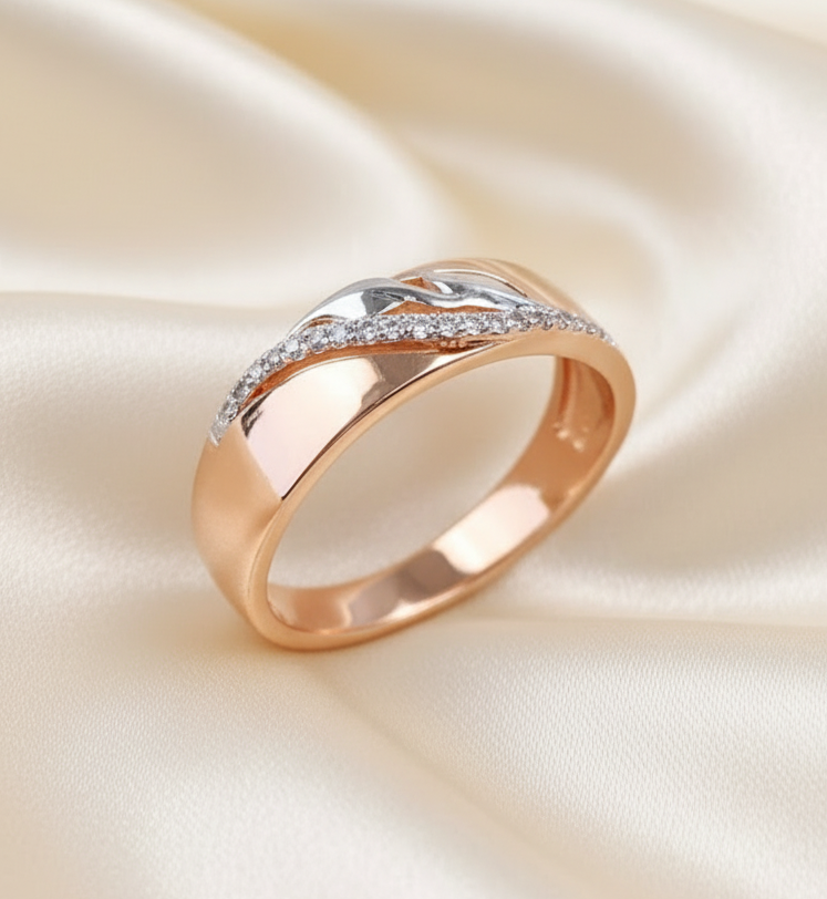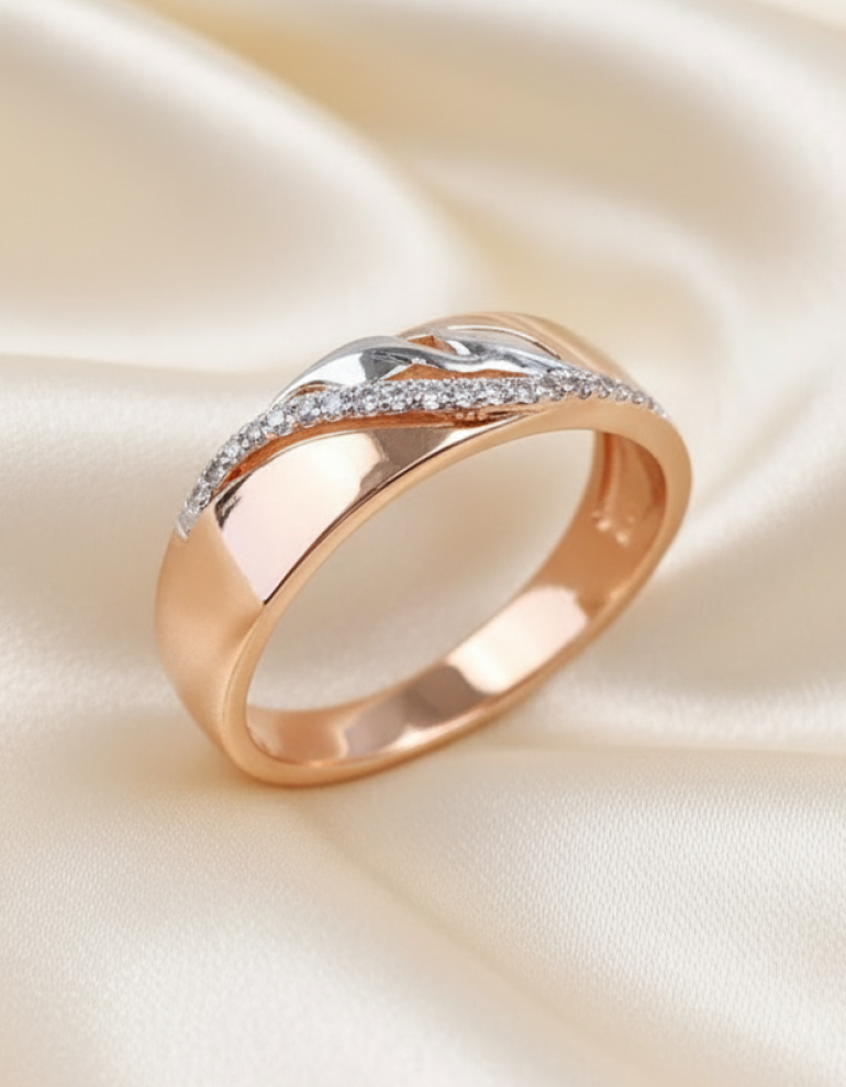 Привлекательное кольцо сможет подчеркнуть красоту рук как совсем юной девушки, так и прекрасной дамы. Классический облик аксессуара гармонично переплетается с романтичной ноткой - сочетанием золотистого и платинового металла и россыпью крошечных прозрачных цирконов. Мерцание прекрасных камней создаёт ореол таинственности вокруг своей обладательницы, и радует нежным сиянием день ото дня.