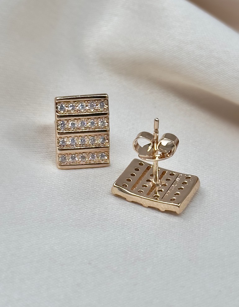 Строгая геометрия в этих серьгах удачно переплетается с игривым блеском крошечных цирконов, словно рассыпанных по всему изделию. Серьги-пусеты остаются излюбленными украшениями представительниц прекрасного пола, за счёт своей универсальности и комфорта в использовании.