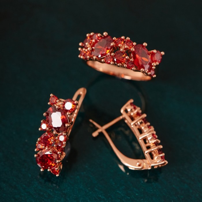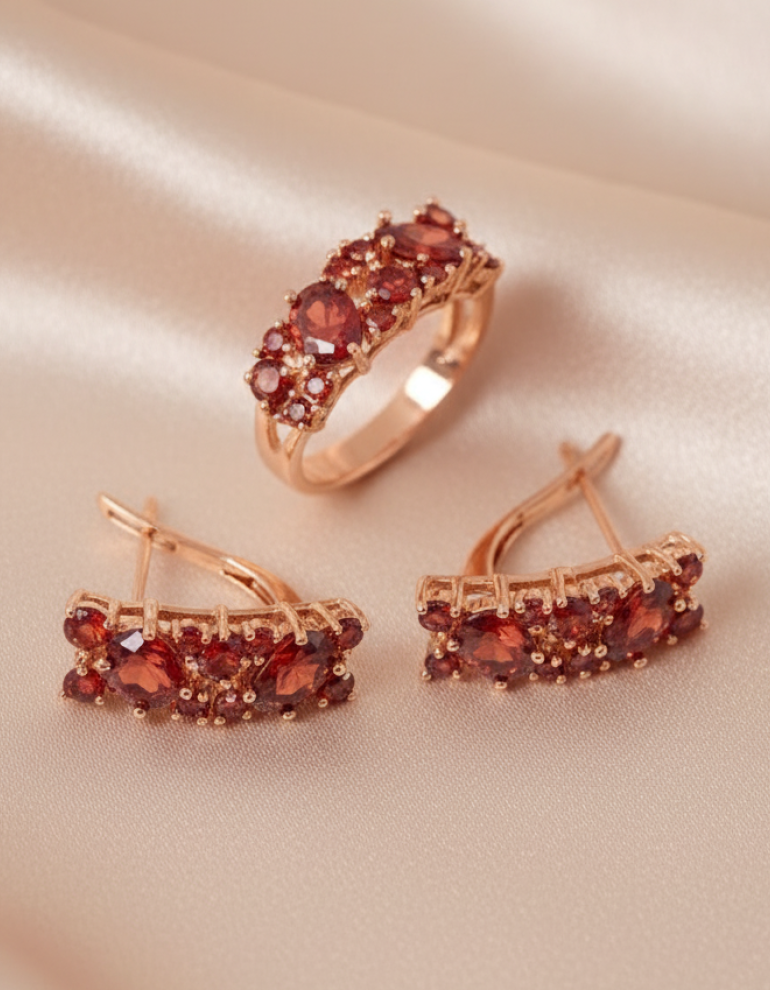 Притягательный и яркий комплект словно создан для страстных и харизматичных представительниц прекрасного пола. Невероятные переливы минералов, насыщенного рубинового оттенка, заставляют вновь и вновь возвращать к своей владелице заинтересованные взгляды окружающих. Несомненная кульминация вечернего образа, этот комплект способен сделать из золушки королеву.